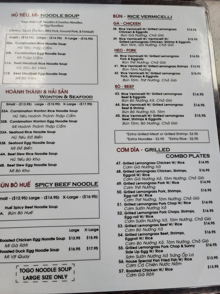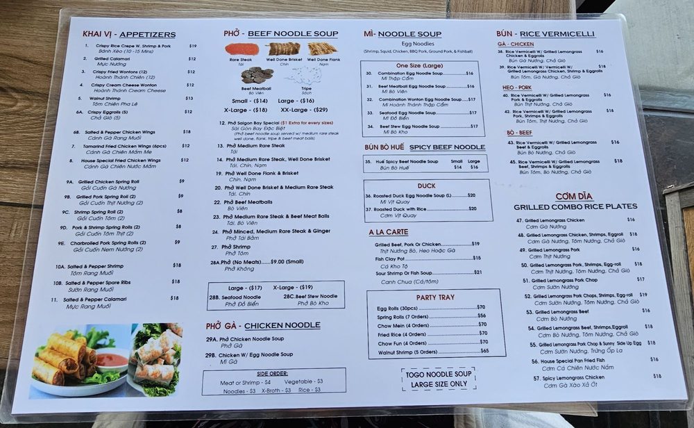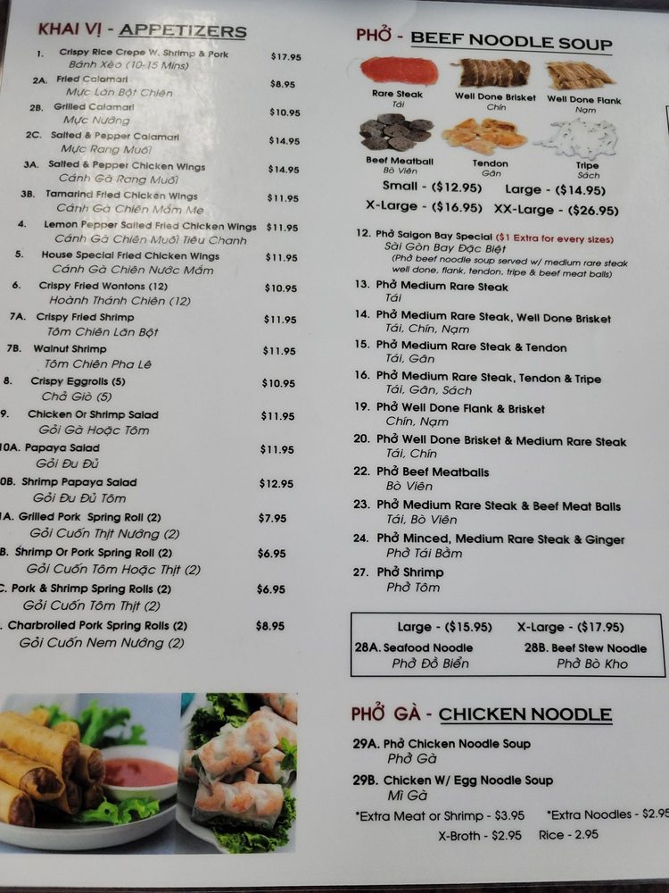 Introducing the menu at Phở Saigon Bay, a Vietnamese restaurant located in Sacramento, CA. Known for its generous portions and flavorful dishes, this restaurant offers a wide variety of options for both meat lovers and vegetarians. From crispy rice crepes with shrimp and pork to grilled calamari and tamarind fried chicken wings, there is something for everyone. Customers rave about the delicious broth in their pho bowls, as well as the fresh ingredients used in their dishes. The restaurant is clean, spacious, and offers quick service for those looking for a satisfying lunch or dinner option. With options for delivery, takeout, and even catering, Phở Saigon Bay is a must-try for anyone craving authentic Vietnamese cuisine.